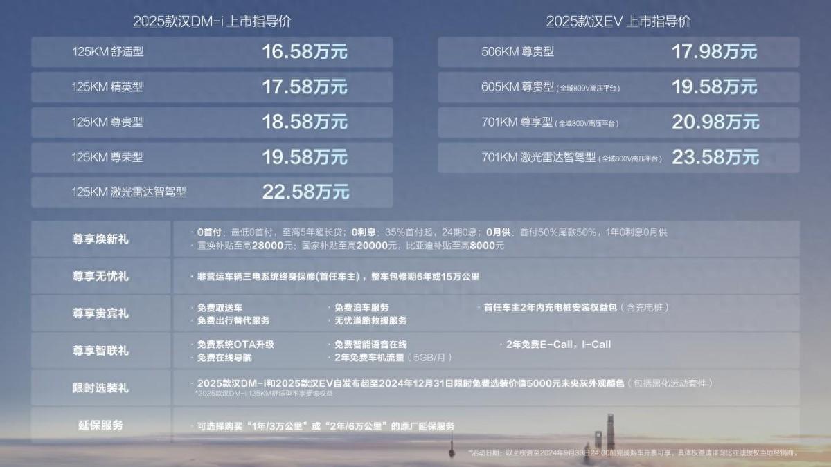 其中,2025款漢EV共推出4款車型,售價17.98萬~23.58萬元;2025款漢DM-i共推出5款車型,售價16.58萬~22.58萬元。同時,比亞迪為用戶準備了包括“尊享煥新禮、尊享無憂禮、尊享貴賓禮、尊享智聯(lián)禮、限時選裝禮、延保服務”六重購車禮遇。值得一提的是,2024年12月31日前,購車可限時免費選裝未央灰車色與黑化運動套件,總價值5000元。