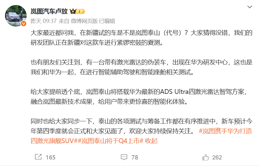 八月十一日,CEO也發微公開表示“這臺偽裝車就是嵐圖泰山(代號)”,目前,泰山也在緊鑼密鼓地進行夏季測試,預計將在今年第四季度正式與大家見面。