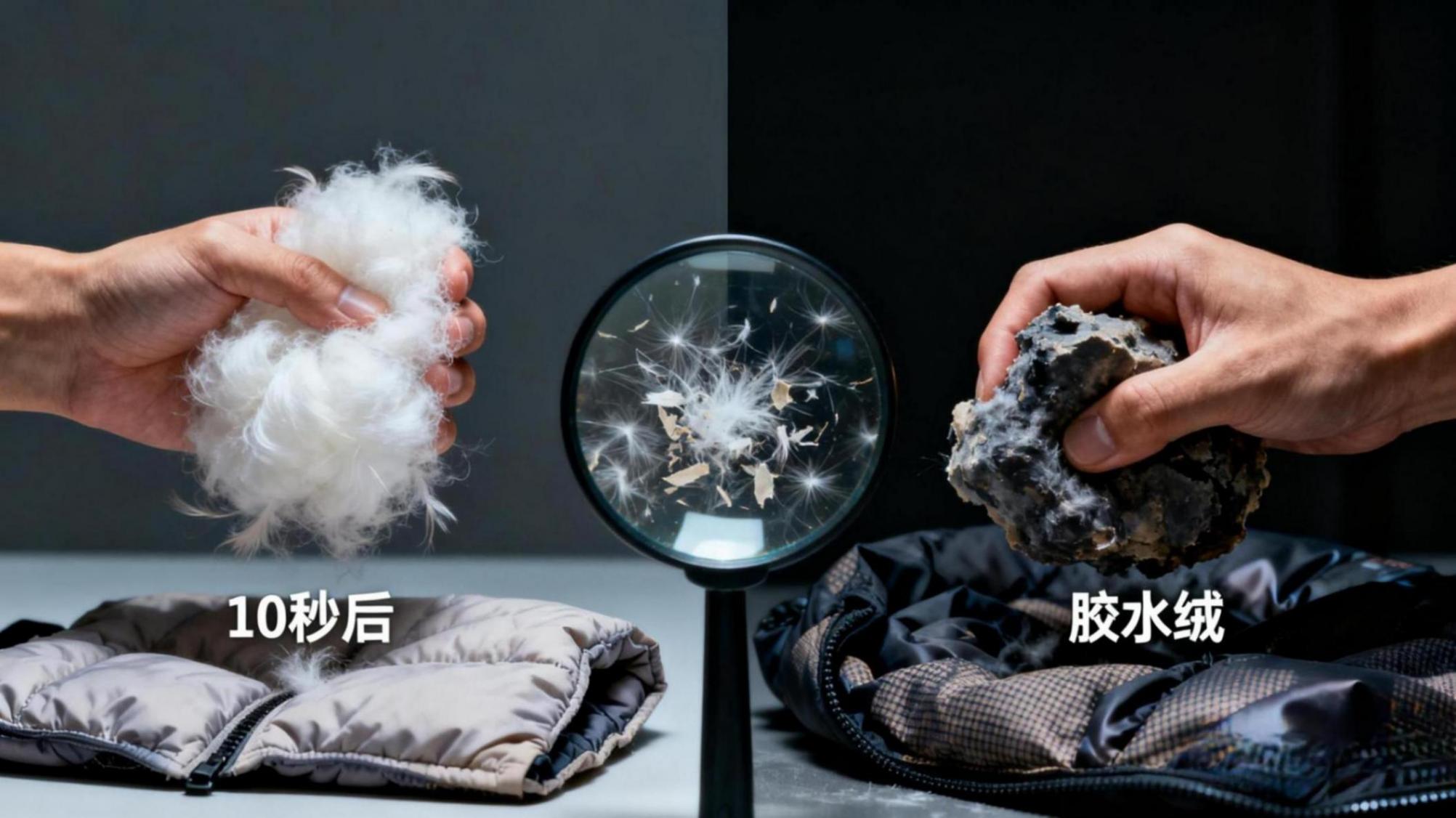 抓一把羽絨服用力擠壓,松開后10秒回彈≥70%才是真羽絨,膠水絨會直接塌陷;湊近聞有無酸味,飛絲混合膠水后常會發酸;輕拍面料,若有細小粉塵掉落,大概率是回收絨加工的 。新國標還規定鉆絨限值為5根/分鐘,穿一天就鉆絨的絕對是劣品。
